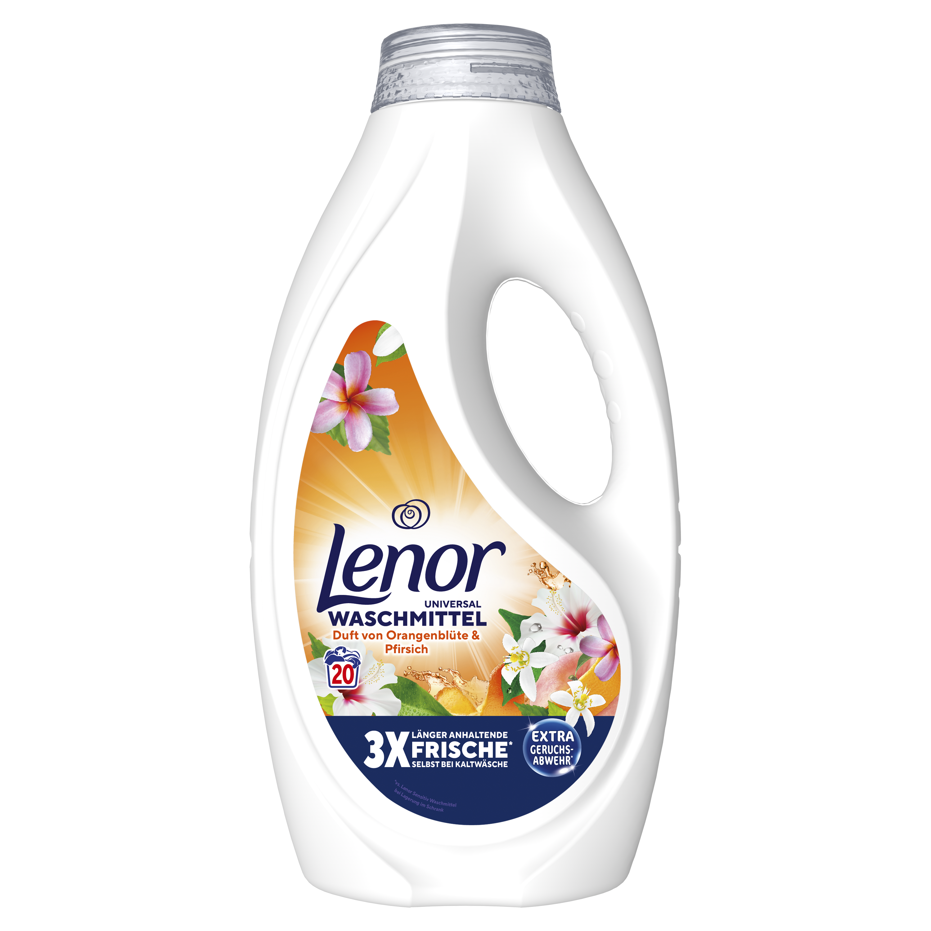 Entdecke das Lenor Universal Flüssigwaschmittel Orangenblüte & Pfirsich für 3x länger anhaltende Frische und extra Geruchsabwehr, selbst bei Kaltwäsche (im Vergleich zu Lenor Sensitiv Waschmittel bei Lagerung im Schrank). Lenor verfügt über eine innovative Tiefenreinheitsformel, die Schmutz und Gerüche selbst bei Kaltwäsche entfernt, um deine Kleidung langanhaltend frisch zu halten! Verwende es in Kombination mit dem Lenor Orangenblüte & Verbene Weichspüler für ein wahres Verwöhnerlebnis! Ich fühl mich wohl in Lenor!