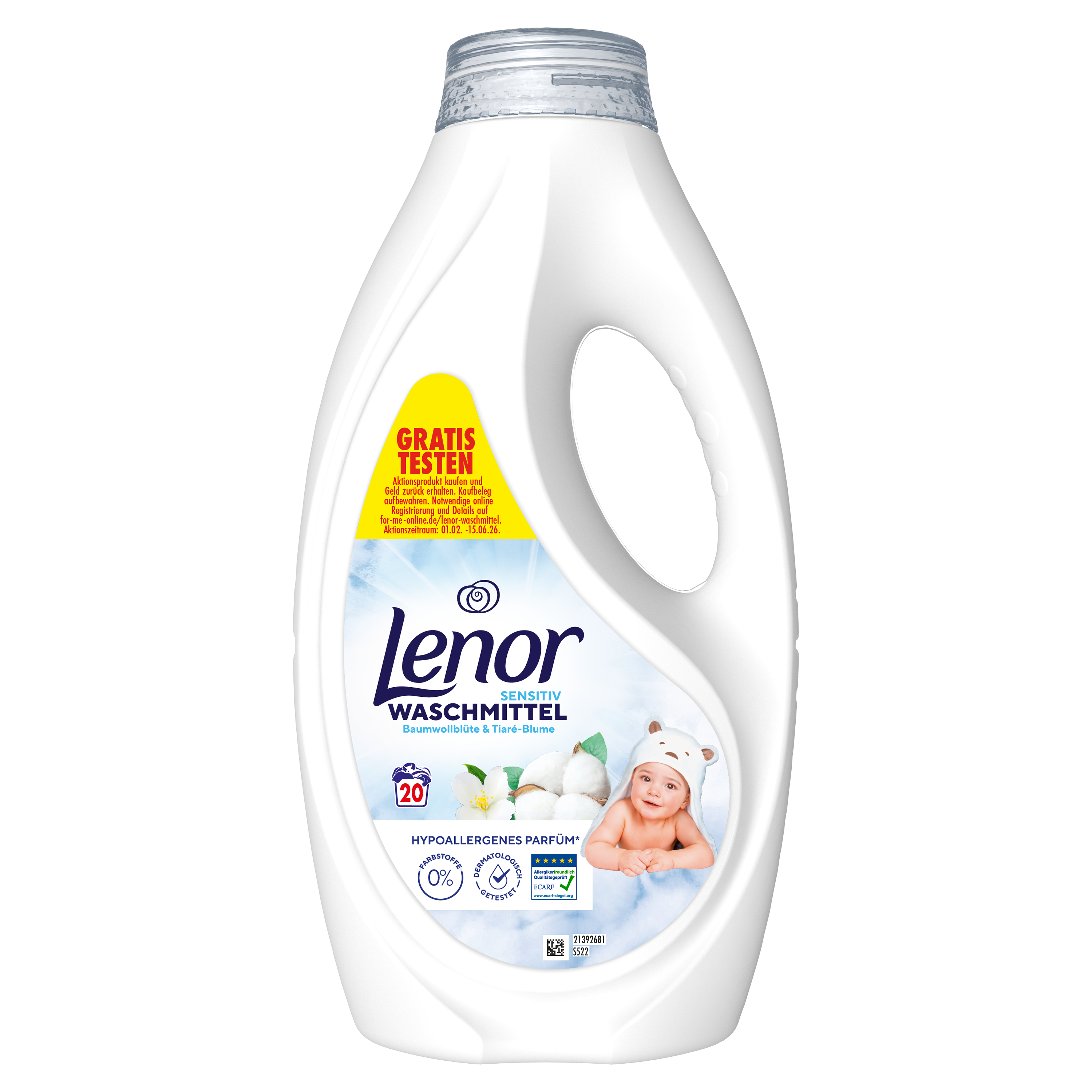 Entdecke das Lenor Sensitiv Flüssigwaschmittel für eine tiefenwirksame und sanfte Reinigung, die speziell für empfindliche Haut entwickelt wurde. Kuschle dich ein, denn der sanfte Duft von Lenor Sensitiv hat eine warme Herznote, die mit kühlen Duftnoten von Baumwolle und Tiaré-Blüte angereichert ist. Lenor Flüssigwaschmittel Sensitiv ist hypoallergen (das Parfüm wurde entwickelt, um das Risiko von allergischen Reaktionen zu minimieren), dermatologisch getestet (für den Hautverträglichkeitstest wurden mit Lenor Sensitiv Flüssigwaschmittel gewaschene Textilien mit der Haut in Kontakt gebracht) und von der Europäischen Stiftung für Allergieforschung (ECARF) zertifiziert. Verwende es in Kombination mit dem Lenor Sensitiv Weichspüler für sanfte Reinheit, Weichheit und Frische.