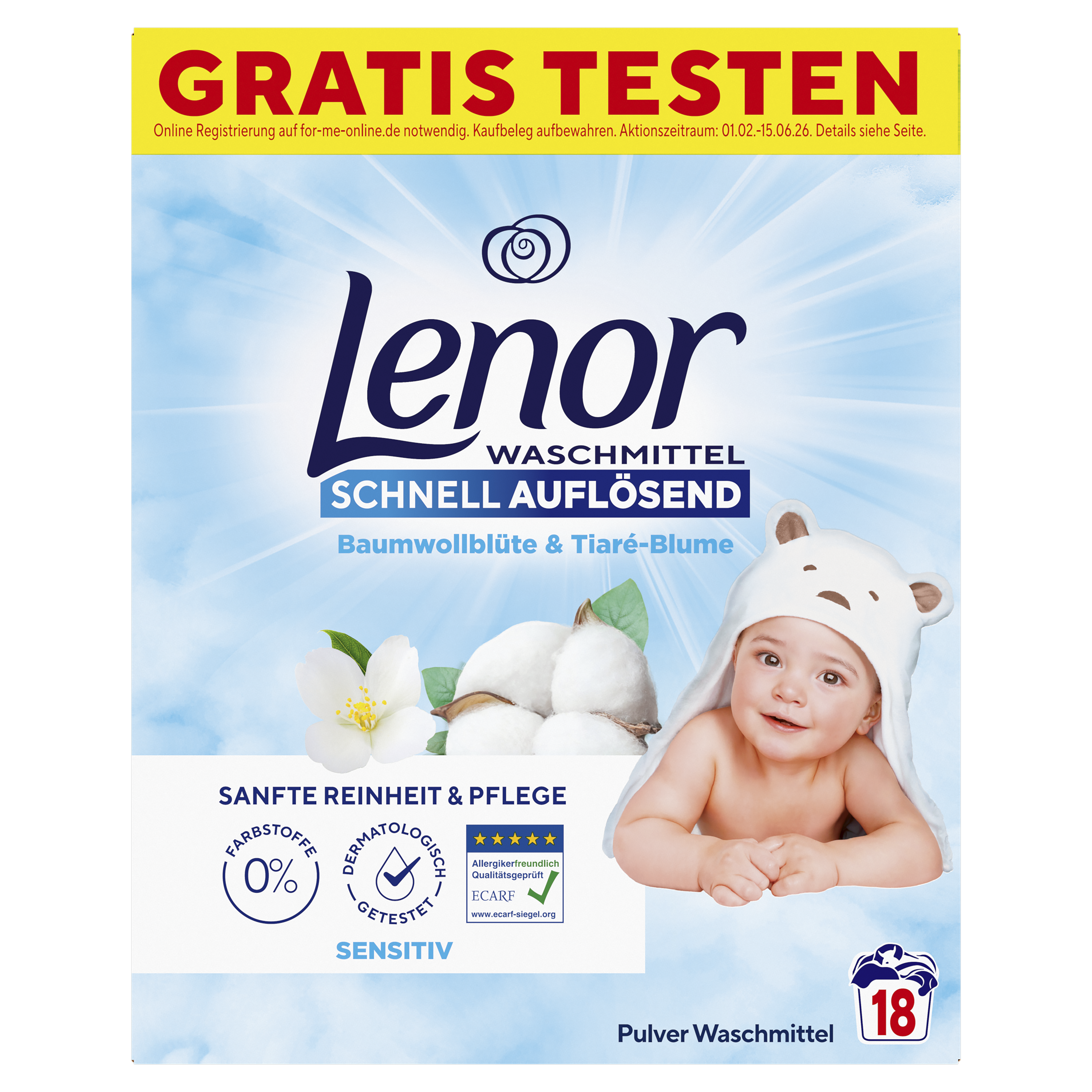 Entdecke das Lenor Sensitiv Pulverwaschmittel für eine tiefenwirksame und sanfte Reinigung, die speziell für empfindliche Haut entwickelt wurde. Kuschle dich ein, denn der sanfte Duft von Lenor Sensitiv hat eine warme Herznote, die mit kühlen Duftnoten von Baumwolle und Tiaré-Blüte angereichert ist. Das Lenor Pulverwaschmittel Sensitiv ist hypoallergen (das Parfüm wurde entwickelt, um das Risiko von allergischen Reaktionen zu minimieren), dermatologisch getestet (für den Hautverträglichkeitstest wurden mit Lenor Sensitiv Pulverwaschmittel gewaschene Textilien mit der Haut in Kontakt gebracht), enthält 0% Farbstoffe und von der Europäischen Stiftung für Allergieforschung (ECARF) zertifiziert. Darüber hinaus hat das Lenor Pulverwaschmittel eine schnell auflösende Formel, die sofort aktiviert wird, wenn sie mit Wasser in Kontakt kommt und eine Tiefenreinigung selbst bei Kaltwäsche bietet. Zusätzlich hilft sie, Rückstände von Waschpulver zu vermeiden. Ich fühl mich wohl in Lenor!